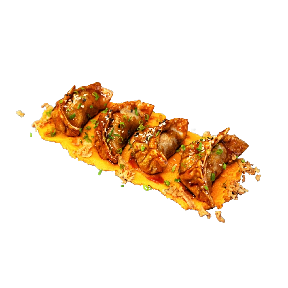 Aluat de orez, creveti, sos teriyaki, piure de batat, ceapa crocantă, ceapă verde, semințe de susan.