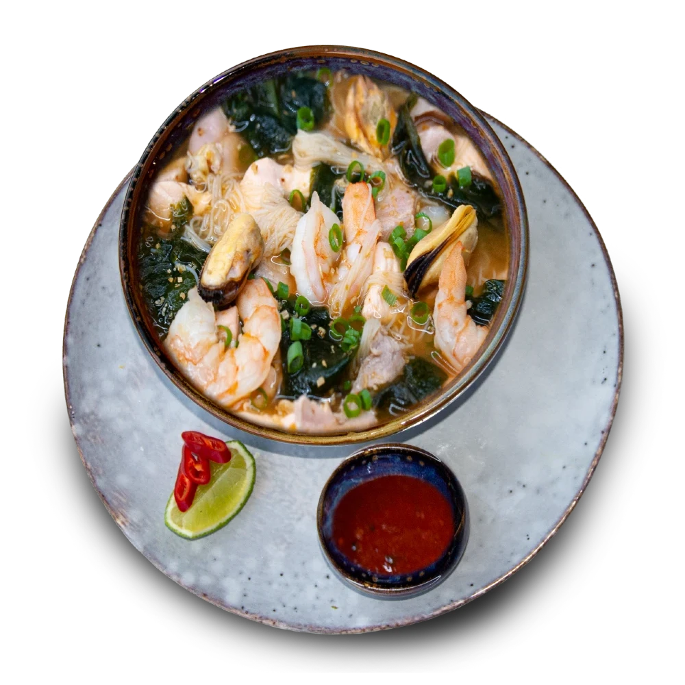 Somon, ton, midii, creveți, alge marine wakame, tăiței de orez, lemongrass, ceapă verde, lime, sos chili.