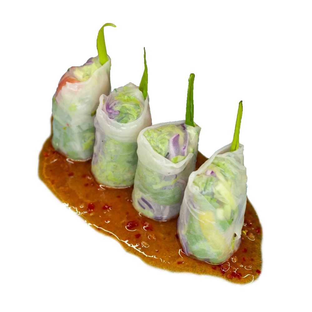 Foi de orez, sos chilli, salată lollo, rucola, varză roșie, castraveți, ardei dulce, roșii, ceapă verde, mintă.