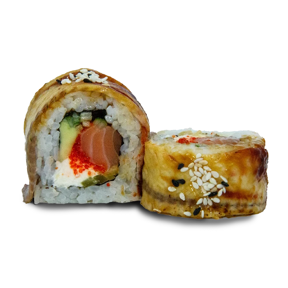 Рис, нори, жареный угорь, лосось, сливочный сыр, авокадо, дайкон, огурец, икра масаго, кунжут, соус унаги.