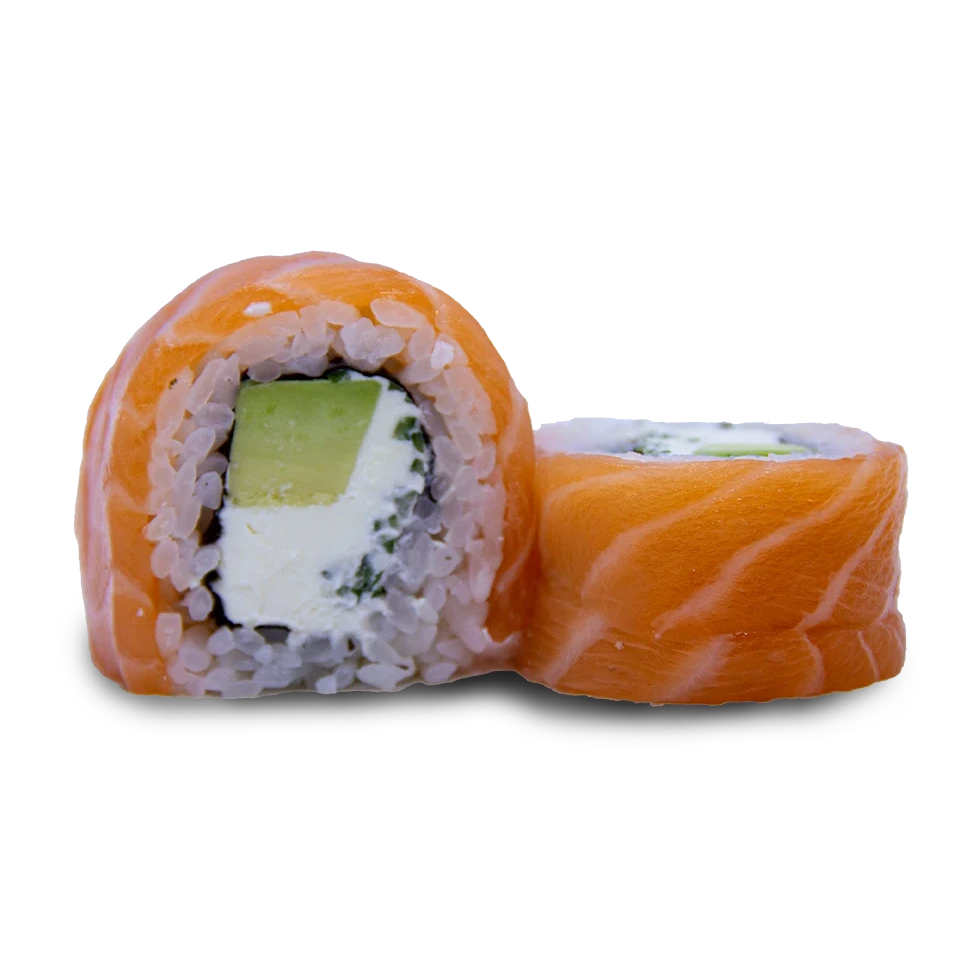 Рис, нори, лосось, сливочный сыр, огурец, авокадо.